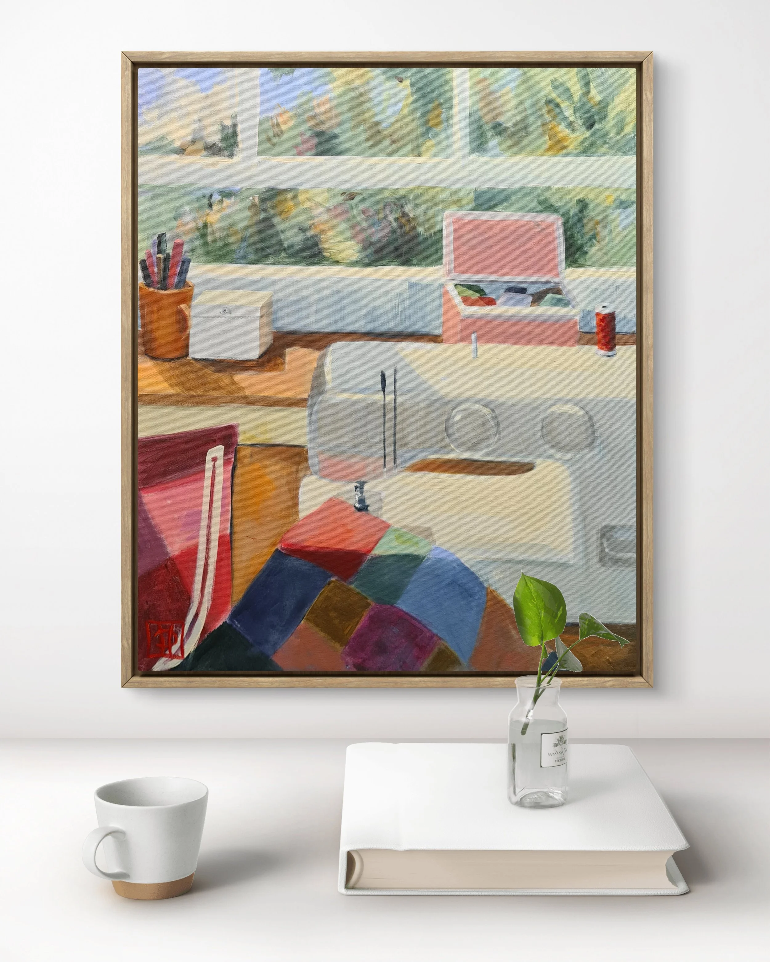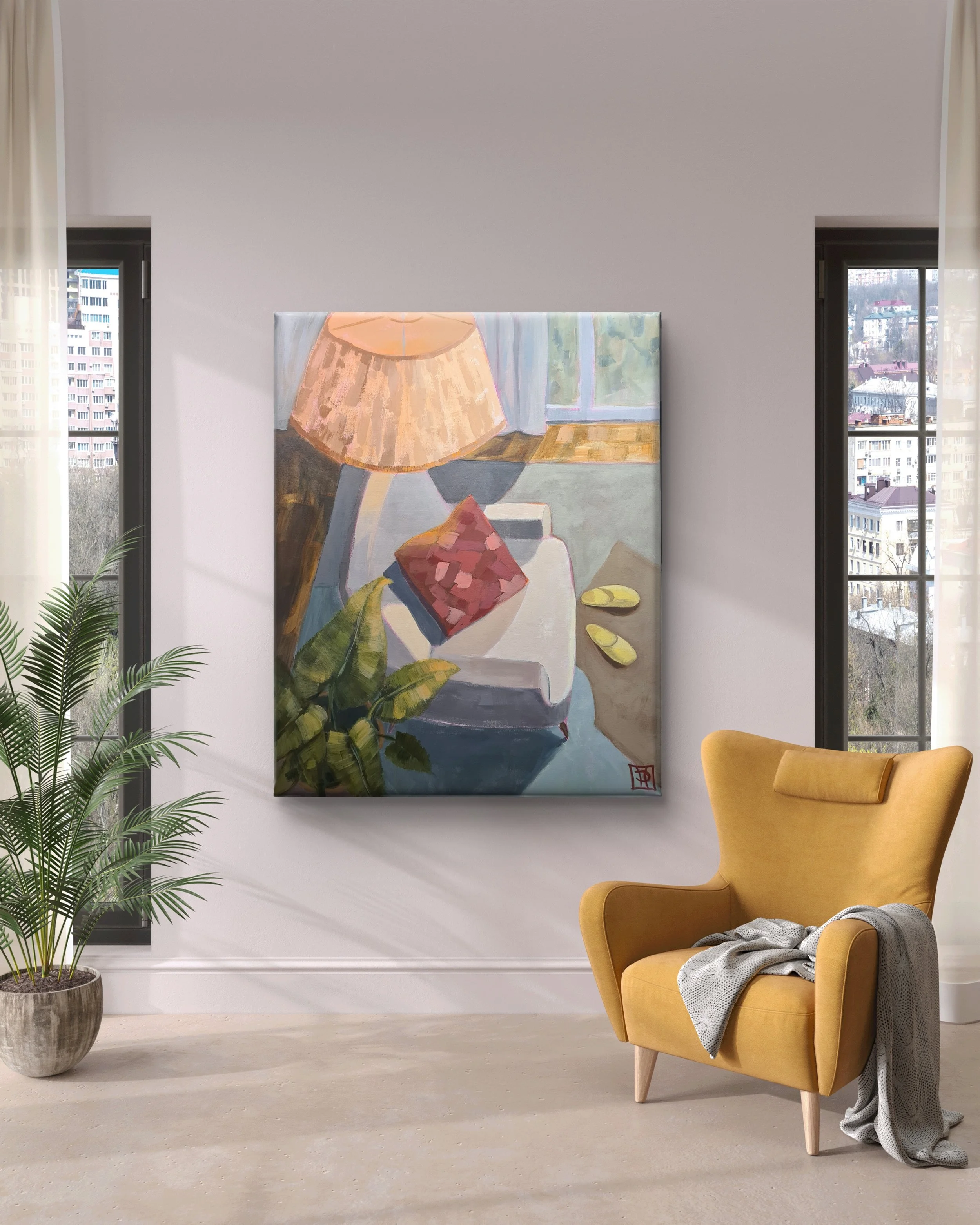 In meinen Gemälden öffnen sich Innenräume als Fenster zu menschlichen Geschichten und Charakteren. Sie bilden einen Gegenpol zur Außenwelt: einen geschützten Raum, in dem die alltägliche Hektik hinter der Tür zurückbleibt. Hier darf es ruhig werden. Das Zuhause als Atemraum – und meine Bilder als Porträts dieser Intimität, die diese Stille bewahren und verstärken.